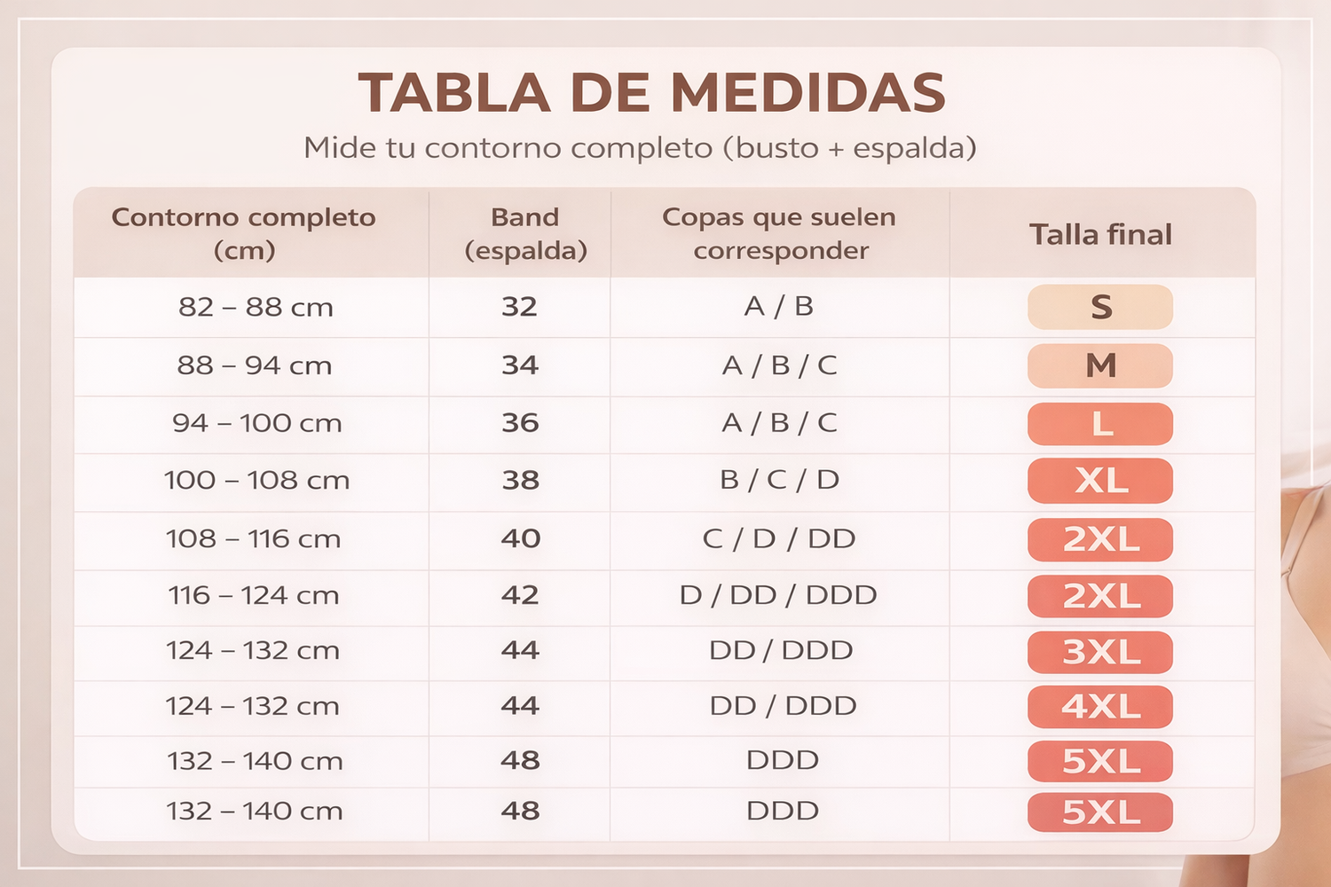 Si no sabes que talla escoger, puedes guiarte con la talla de brasier clasico o medirte el contorno de tu busto medio